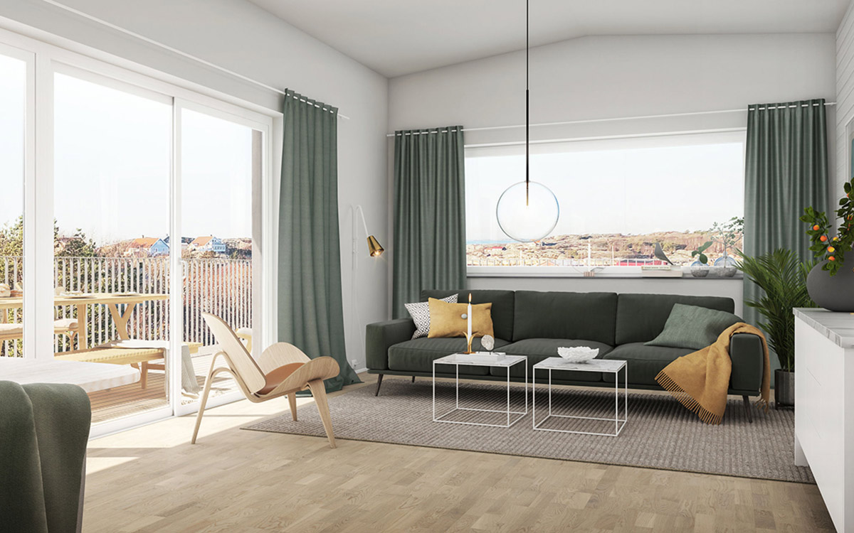 Under hösten 2019 startar vi byggnationen av 7 arkitektritade enplanshus med fantastiskt läge och utsikt på granitklippor med västerhavet som granne på platån ovanför Kolkärrsvägen. Husen är 102m² med 4 rok. Utvändigt förråd är praktiskt placerat vid entrén. Då tomten utgör naturtomt blir skötseln minimal om man inte önskar att finplanera delar av den. Arkitektens tanke är att husen skall smälta in i omgivning. Husen är som nedsläppta i naturen. Terrassen vid huset blir den naturliga platsen för att njuta av havsmiljön. Skjutpartiet ut på terrassen suddar ut gränsen mellan inne och ute. Varma vårdagar sätter man sig ute på terrassen eller drar sig innanför öppningen och njuter av solen i lä med en kaffe och blickar ut över land och hav. Den öppna planlösningen mellan vardagsrum och kök ger stor rymd med sitt fina ryggåstak med 3,5 m i takhöjd.